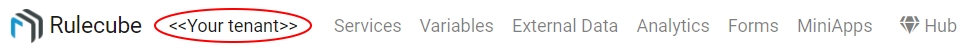 The access to Rulecube is organized in tenants and a tenant is an application instance of Rulecube that represents your organization. So when you start working with Rulecube, you'll be provided your tenant, which you can see in the menu bar: