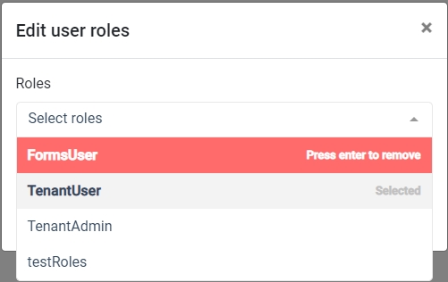 - If you want to remove a role, in the Roles list, select the role—the row turns red—and press - Enter.