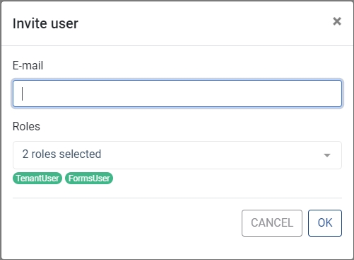 - Click Invite user. ↳ The Invite user pop-up opens:  Note that the roles Note that the roles- TenantUserand- FormsUserare pre-selected for the invitee.