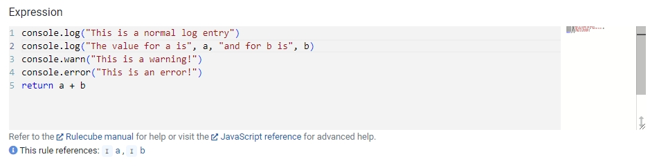 Tips and tricks for debugging your rulesets. Explains how console.log can be used in your code.