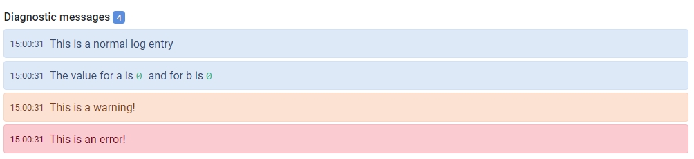 The API result from an execute will contain your logging in the diagnostics property. This is an array with the following object structure: