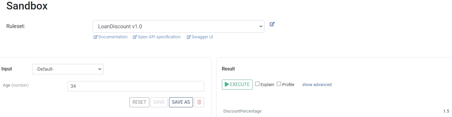 34and click Execute. ↳ Your rule is run and shows the expected value of1.5for theDiscountPercentageoutput:
