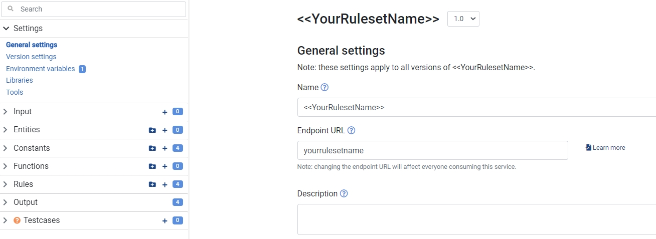 Click OK. ↳ Rulecube creates the ruleset and shows the General settings page for the ruleset: