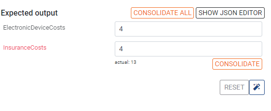 We could manually fix the value for InsuranceCosts here to match the actual value 13. An easier way is to press the CONSOLIDATE button below it. This will automatically change the expected output to match the actual output.