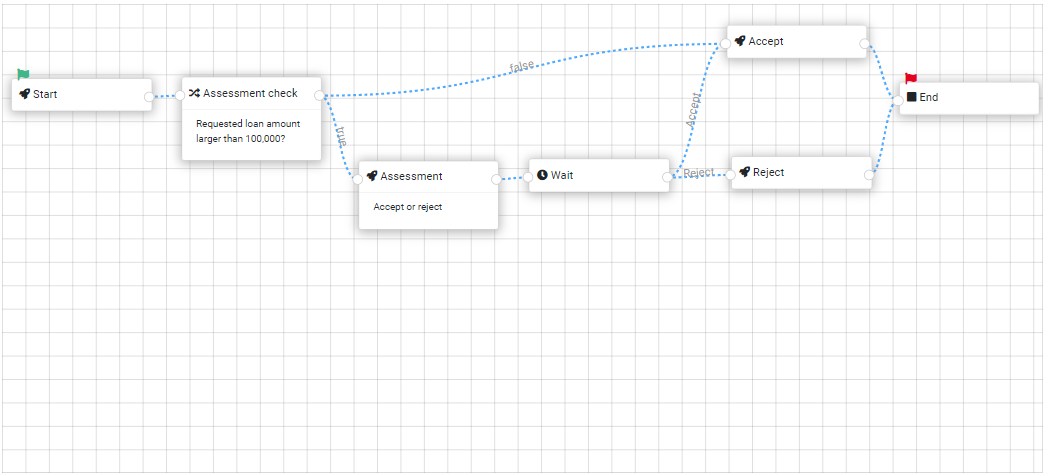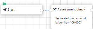 Requested loan amount larger than 100,000?Connect the Start step to the Assessment check step by clicking on the little circle in the Start step, holding your mouse, and dropping on the left circle of the Assessment check step. ↳ Rulecube adds a dotted blue line between the steps to indicate that they are connected:
