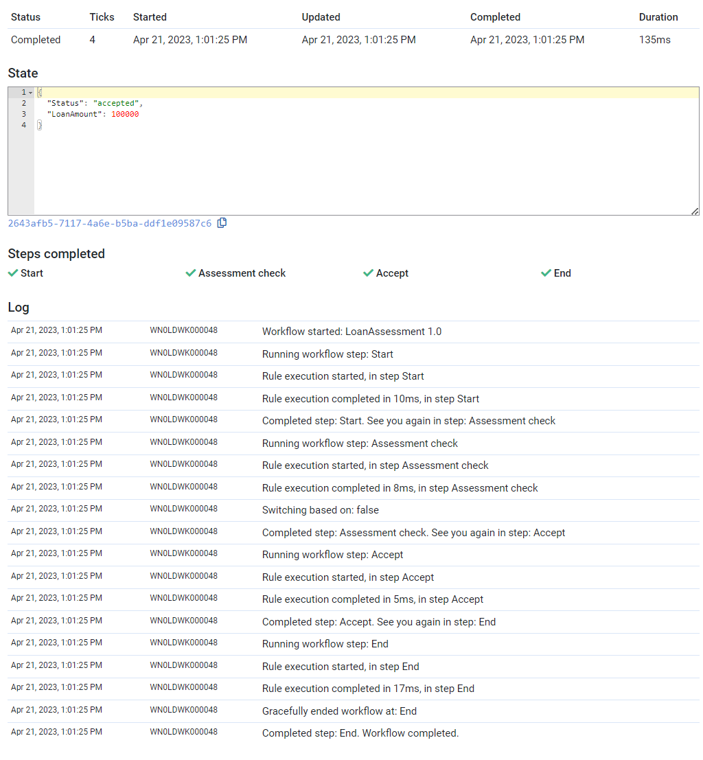 100000.Click Start workflow. ↳ The workflow runs, and the Result section shows the State object and the execution Log:
