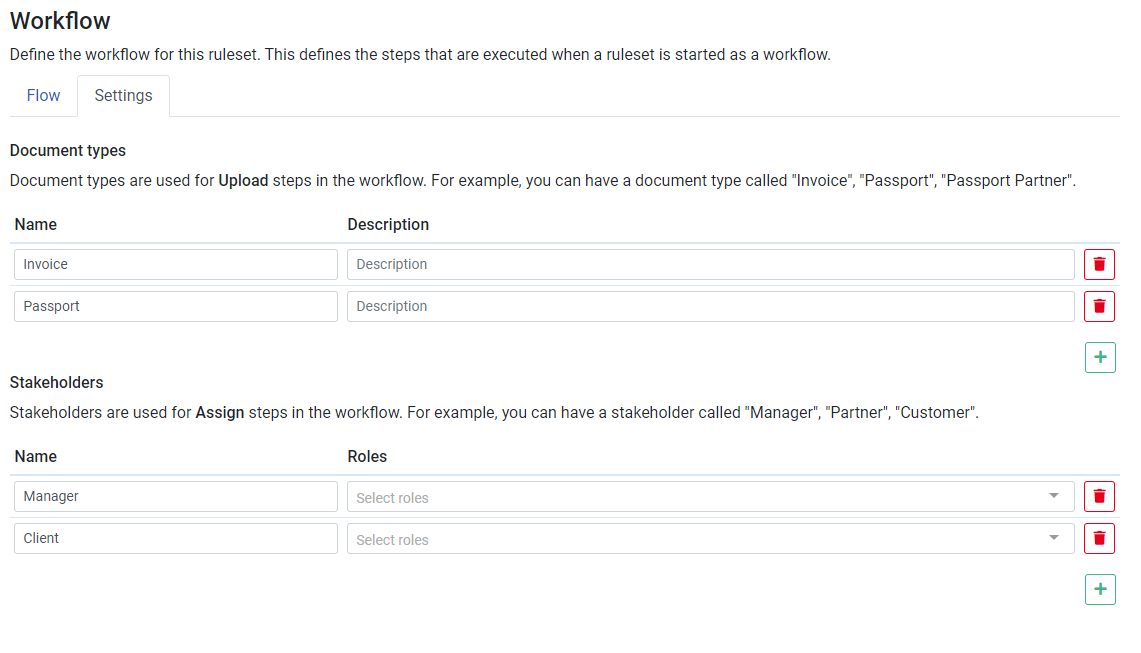 In the workflow settings screen, we can define Document types and Stakeholders.