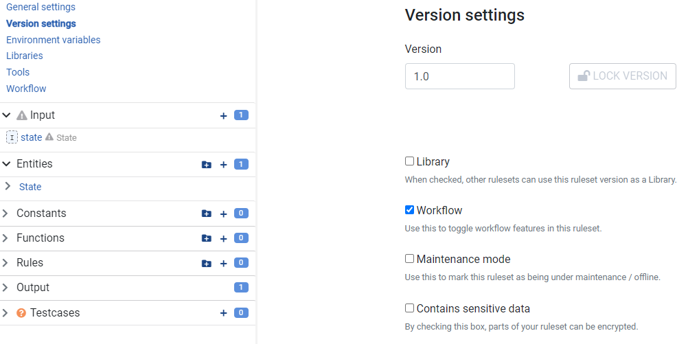 Select the Workflow checkbox. ↳ Rulecube turns the ruleset into a workflow and adds the Workflow option to the left-hand menu, and creates the