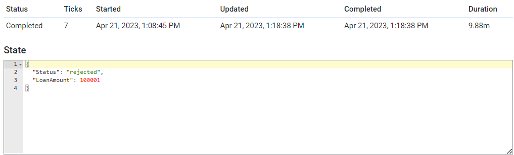 Stateobject indicates that theStatusisunder review.Click Reject. ↳ The workflow resumes, rejects the loan, and finishes: