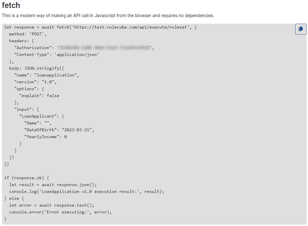 Rulecube makes your development life as easy as possible and automatically provides a JavaScript example of how to call and consume the API of each ruleset.