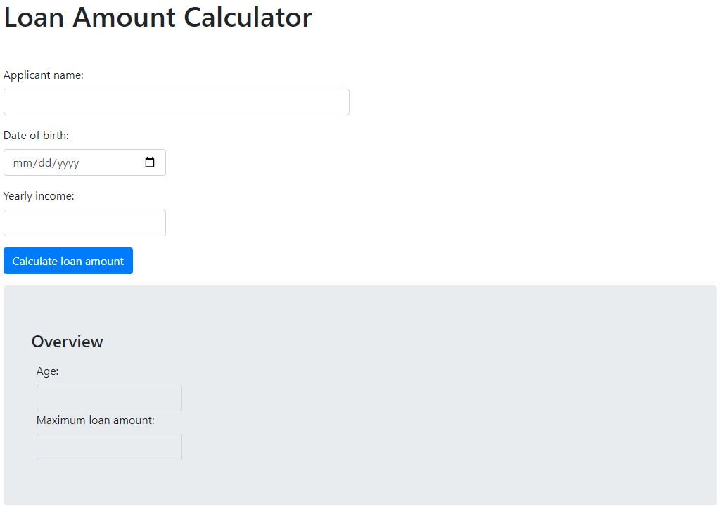 Enter input values into the calculator and click Calculate loan amount. ↳ The JavaScript code calls the ruleset through its API and parses the output into the web page.