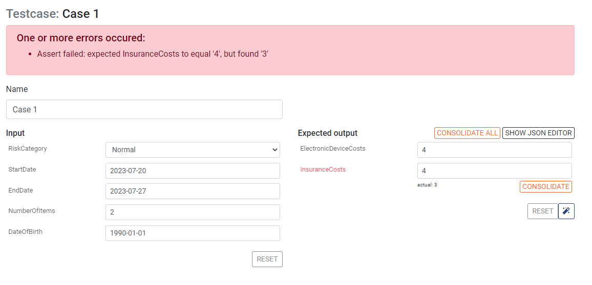 We could manually fix the value for InsuranceCosts here to match the actual value 13. An easier way is to press the CONSOLIDATE button below it. This will automatically change the expected output to match the actual output.